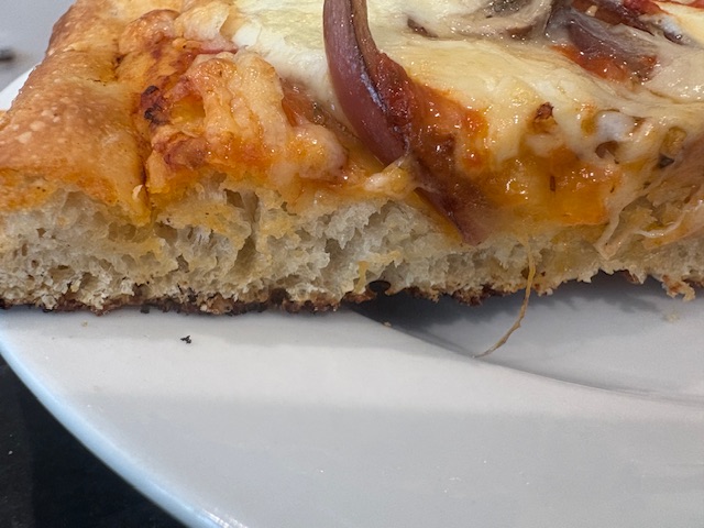 Crust is so light and so crisp but tender. Bottom browns perfectly due to coating the baking sheet with a cold stick of butter. Never oil. The cooked crust releases perfectly every time. I coat the finished crust lightly with sauce then top with Monterey Jack grated cheese then the mushroom/ onions precooked and drained. Then Fresh Mozzarella cheese and then drop tiny amounts sauce over and lastly Parmesan. Bake without pan on rack til bubbly 15 min or so at 450-425 watch closely. ( place empty sheet pan on shelf below in case of drips. This further crisps the bottom .)