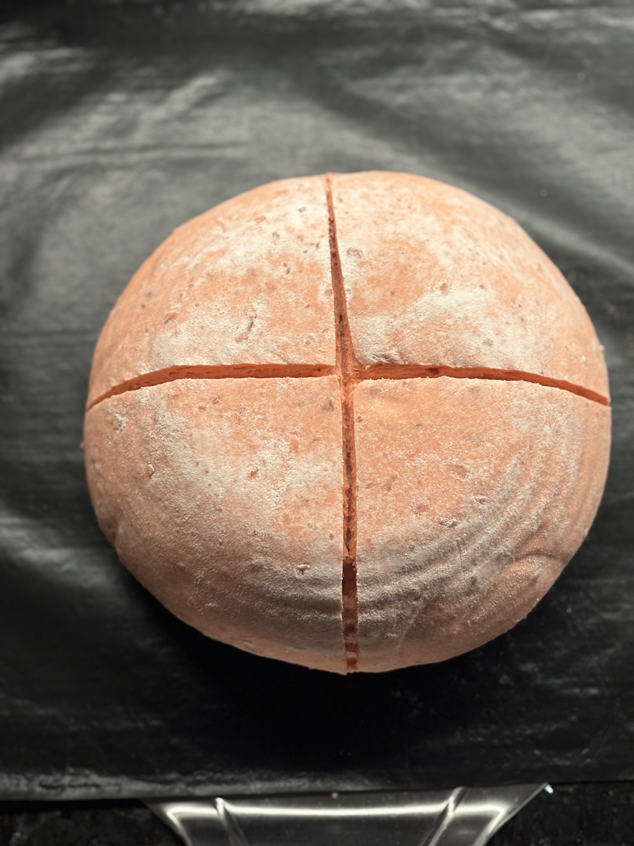 Fresh from the oven (looks a bit underproofed, maybe not obvious from this perspective):