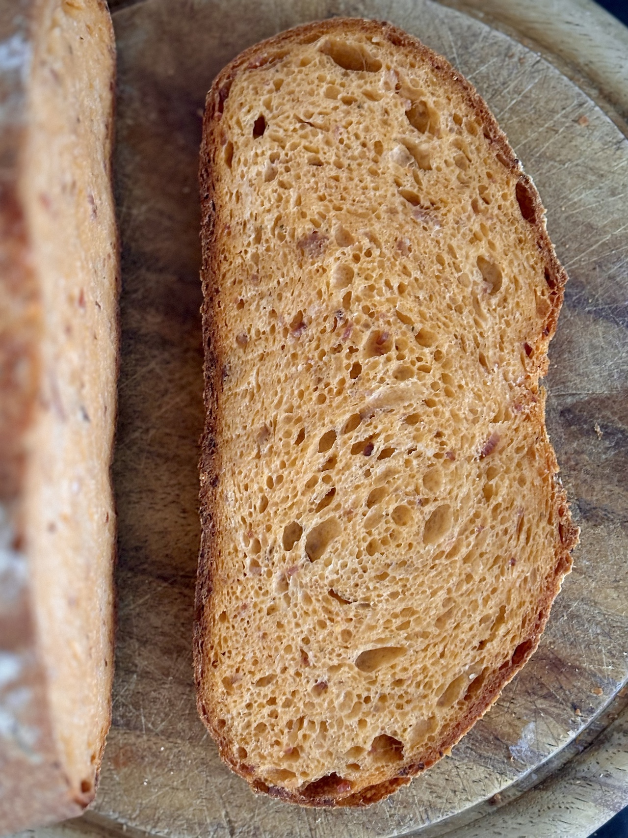 This looks awesome! Love the flavor combo and your crumb looks perfect. I made a tomato based dough a looooong time ago but definitely didn’t add bacon which I love.