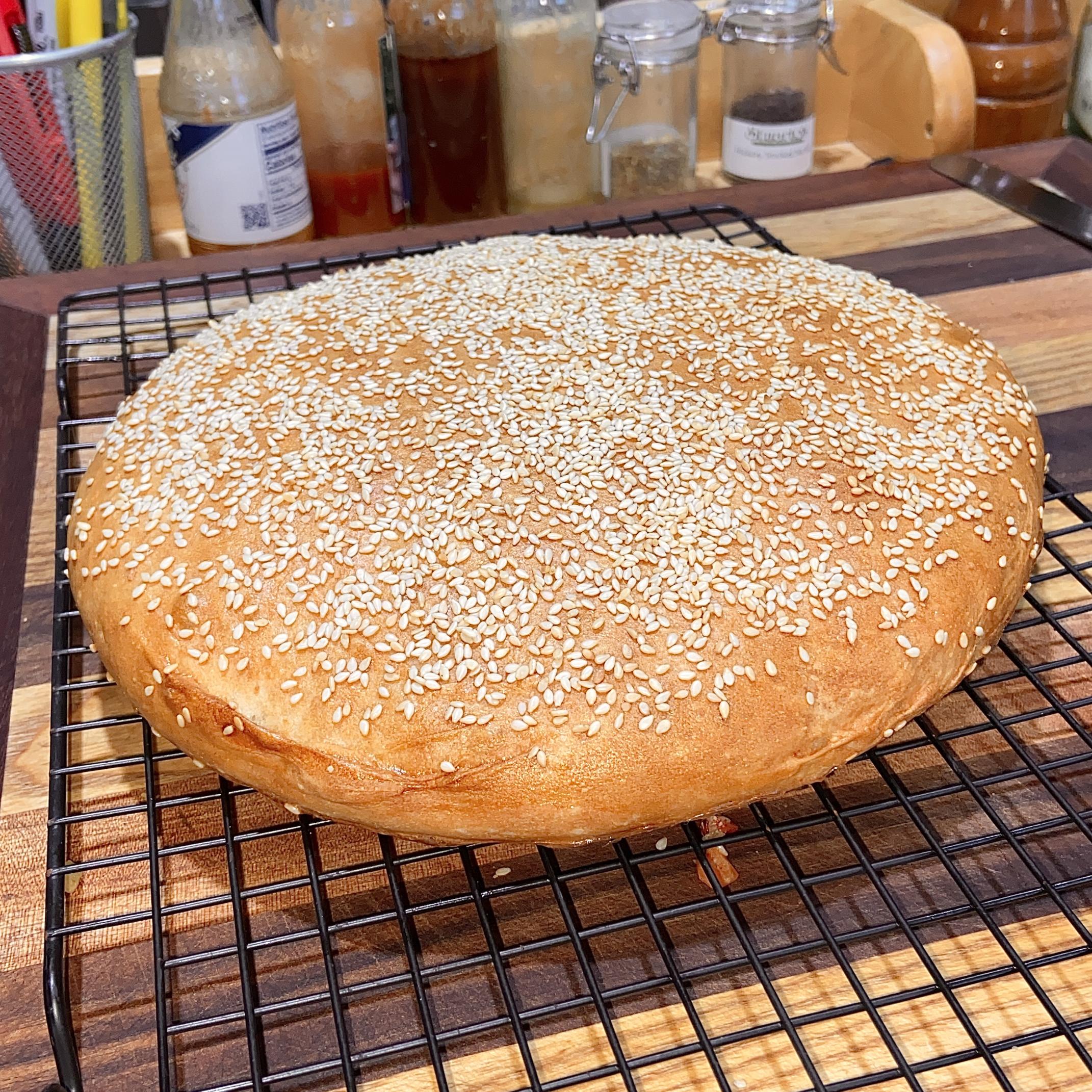 - 4:25 - ~ doubled, rolled out into circle, put on parchment on baking sheet, sprayed with water and sprinkled with sesame seeds.