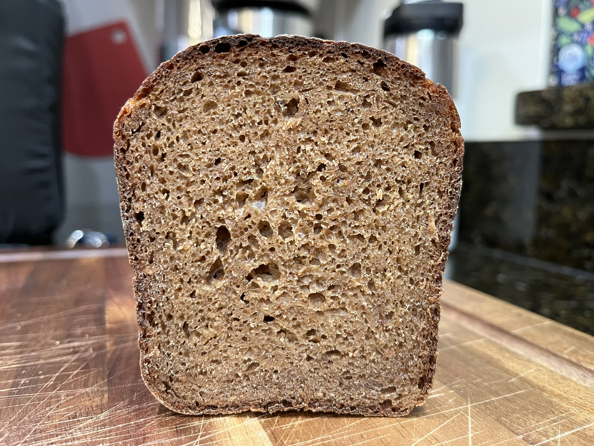 This one is 66.2% whole rye and 33.8% first clear at 80% hydration. It also has 7.9% red rye malt (I used Fawcett's), 1% ground caraway and 11.5% honey. That ground caraway gives it a nice aroma (it smelled really great during the bake) but in a somewhat different way than the Jewish deli ryes from the store.