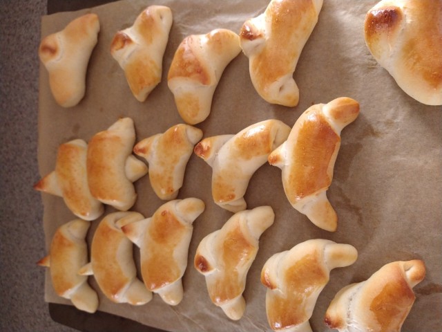 I'm not trying to horn in on your thread, just thought this might be useful. I used the Hungarian recipe. They turned out quite well, fairly light, but definitely breadlike. I'm not too sure what exactly to expect, but they taste good. They look like dolphins. 😊