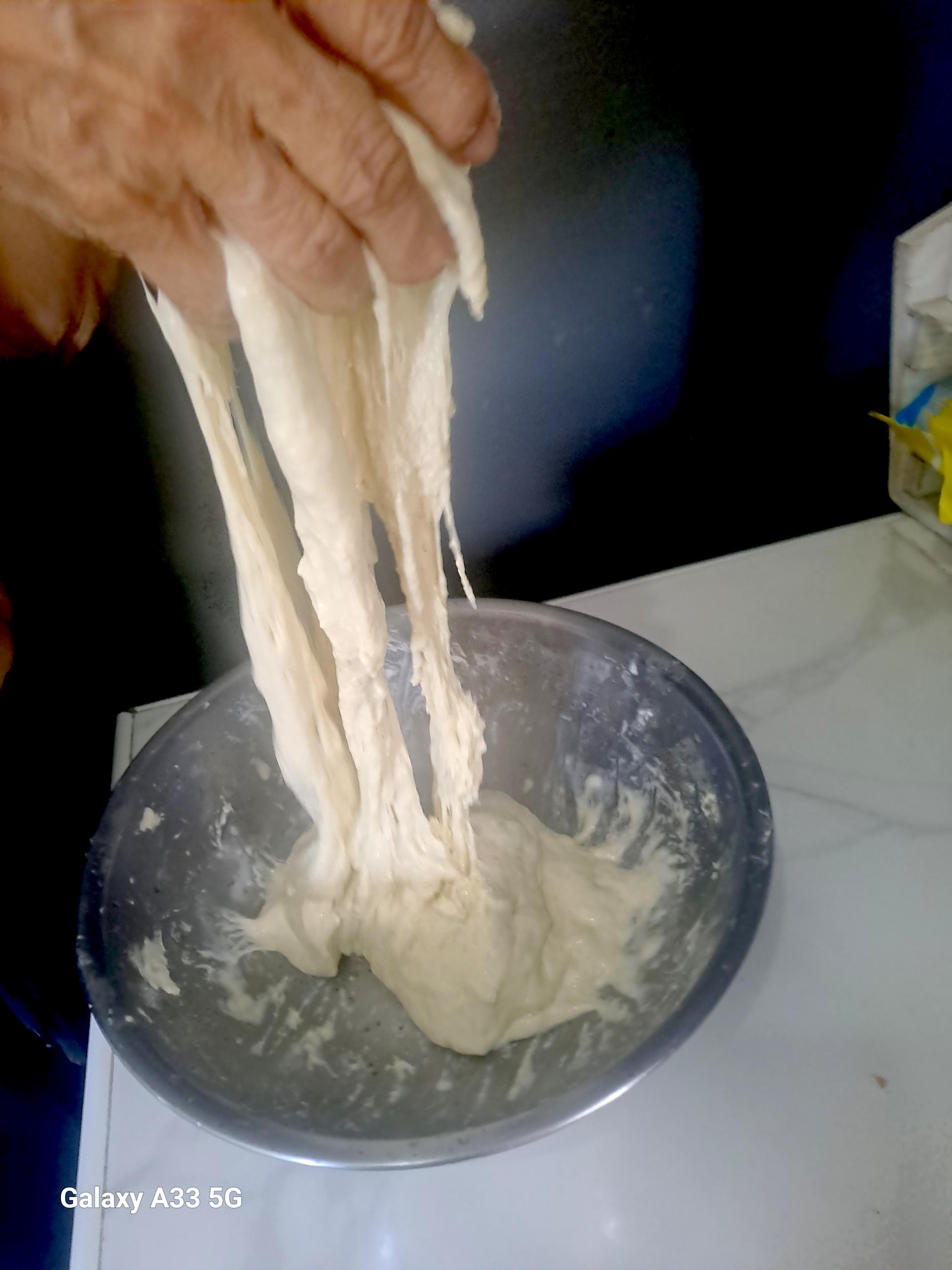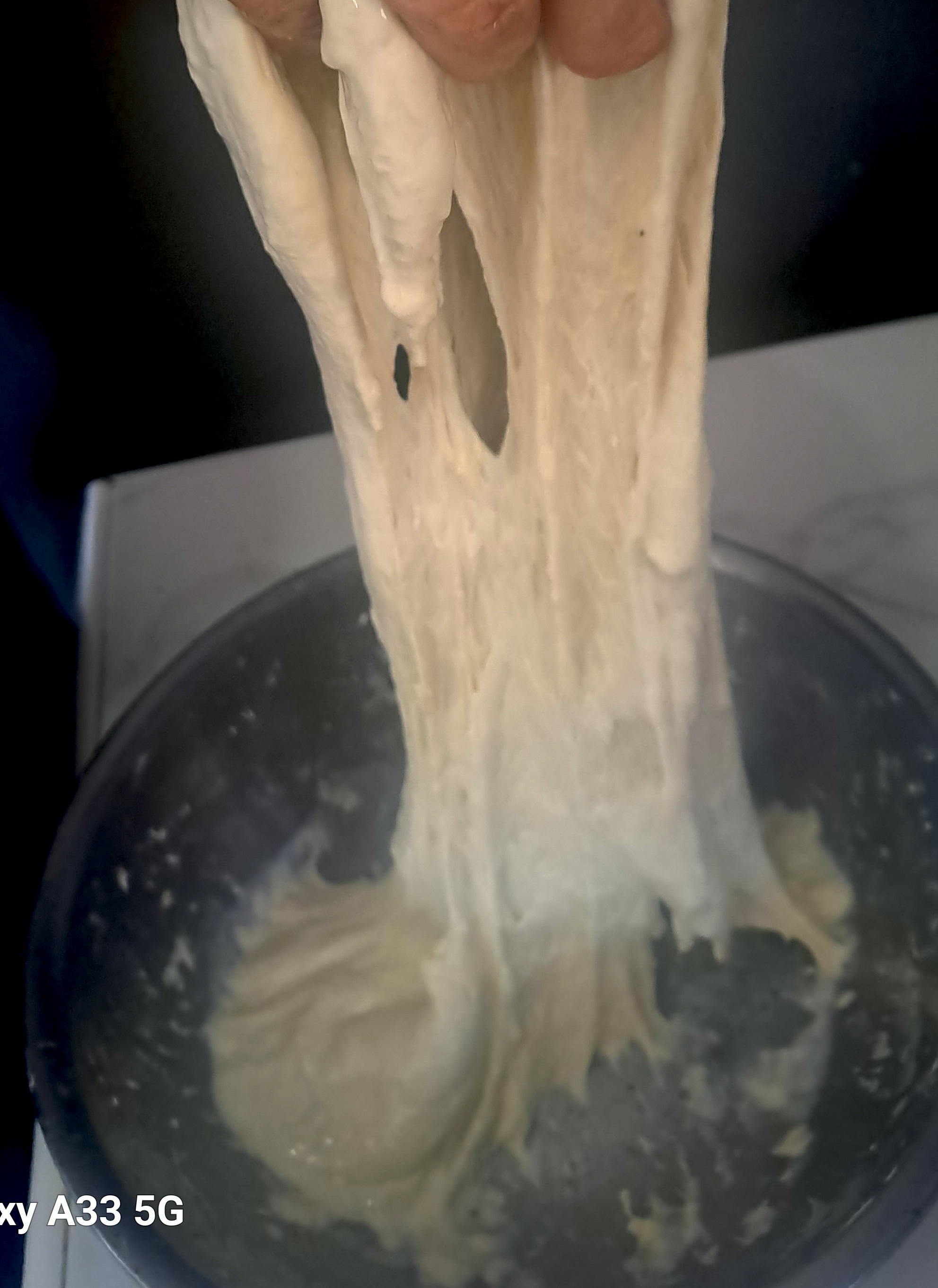 I like how you describe your treatment of the dough, Katie. Lots of upfront rough treatment definitely mechanically develops the gluten. But I'm not sure you can do much tugging and slamming with the very gooey dough you have at the moment.