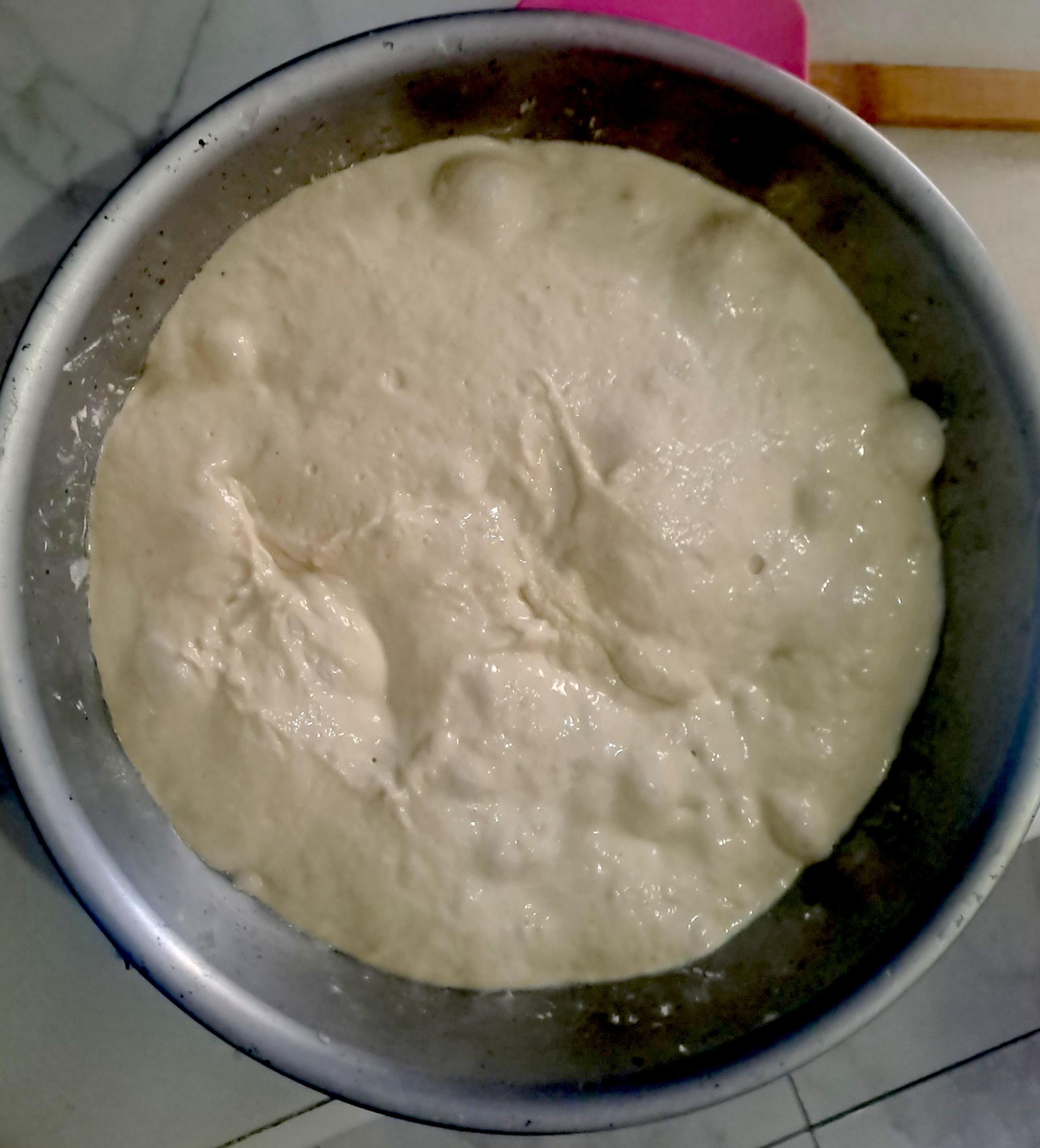 NOTES: As expected, the dough was sticky and lacked structure after the 5-min mix. After first Coil-Fold not much development, the dough tore after stretching 6 to 8 inches. After second Coil-Fold there was a small improvement. After third Coil-Fold (see photo), again better but a real cow-pie though the dough was much smoother. After fourth Coil-Fold dough was not much improved and little if any increase in volume. Following 1-1/2 hour fermentation, dough was slack, jiggly and some bubbles had formed on the surface. After 24-hour cold fermentation, dough was jiggly and had continued to rise (see photo), at least doubled in size but over proofed. Comments please...