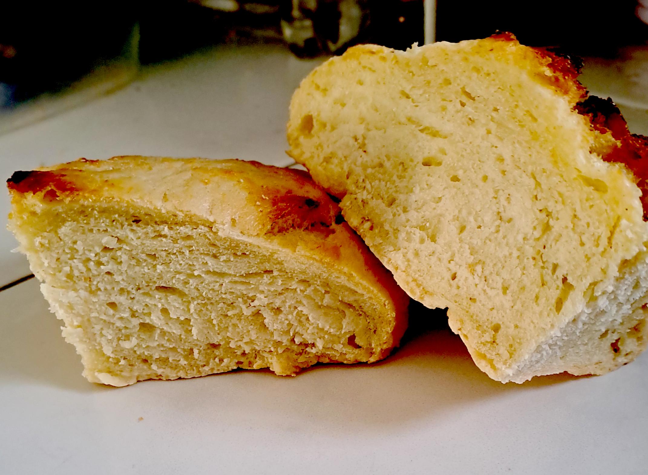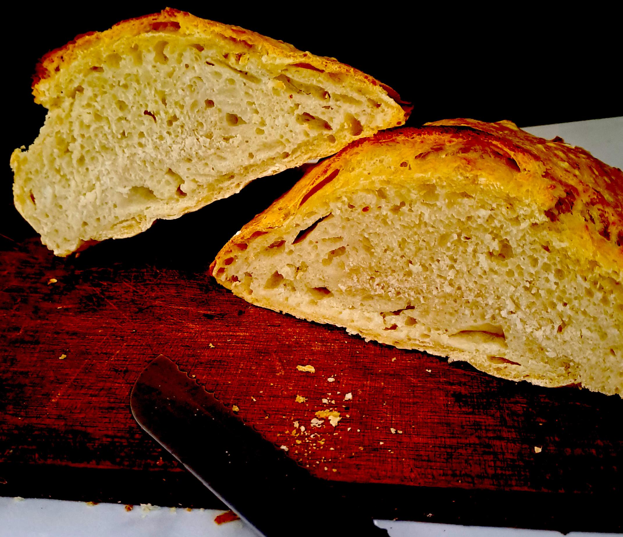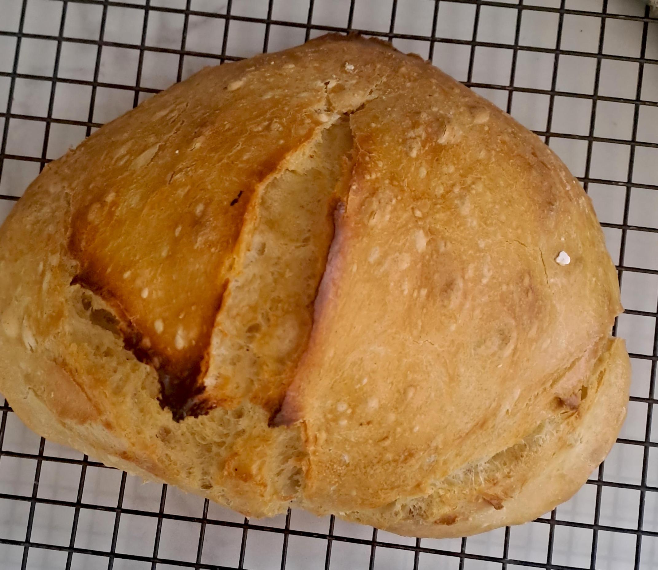 There was no way I could shape or score the dough. It was like a bowl of porridge. I basically shoveled it into the hot skillet, poked it into shape and hoped for the best. Bake was at 480F, 20-min covered, 20-min uncovered. I got a reasonable oven spring and the bread scored itself, luckily. The crust wasn’t crispy-crunchy but wasn’t like cutting glass either. And the crumb was soft and chewy and, for the first time, I saw the beginnings of an airiness. The taste wouldn’t win a ribbon at the fair but was pretty tasty.