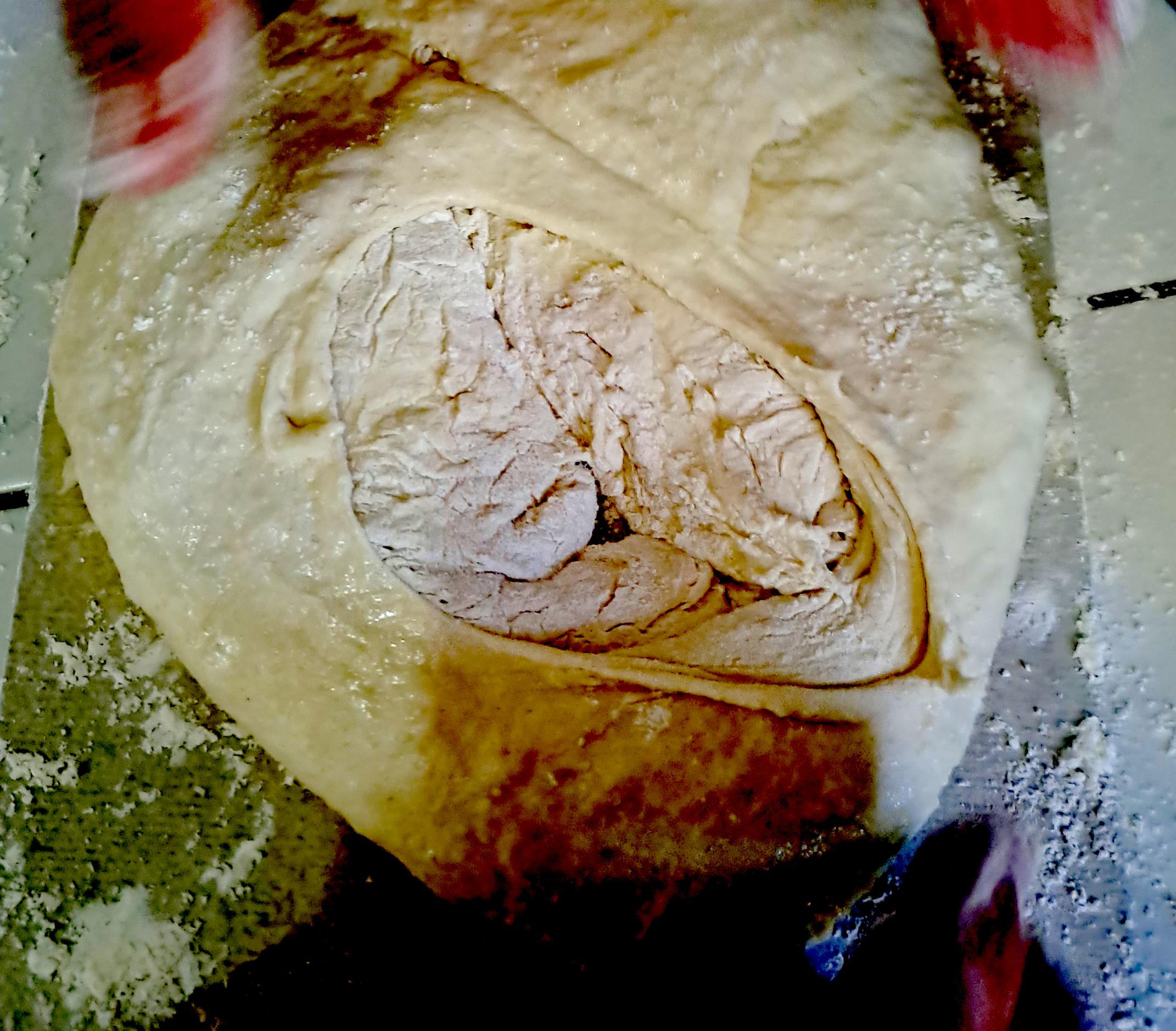 Then I did a Coil-Fold, reaching under the dough and stretching the middle upward until the dough began to tear and rolled it onto itself. I did four coils per session for four sessions, allowing the dough to rest for 30-min between each session.