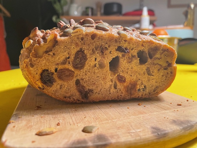 But the eating is great: who can complain about a tasty loaf full of lightly toasted walnuts, raisins and (my addition) pepitas? For the future, I could either ferment it longer using yeast water or potentially spike it with rye sourdough (perhaps instead of adding rye to the loaf) to turbocharge the fermentation and add a bit more oppositionality to the raisin & apricot sweetness.