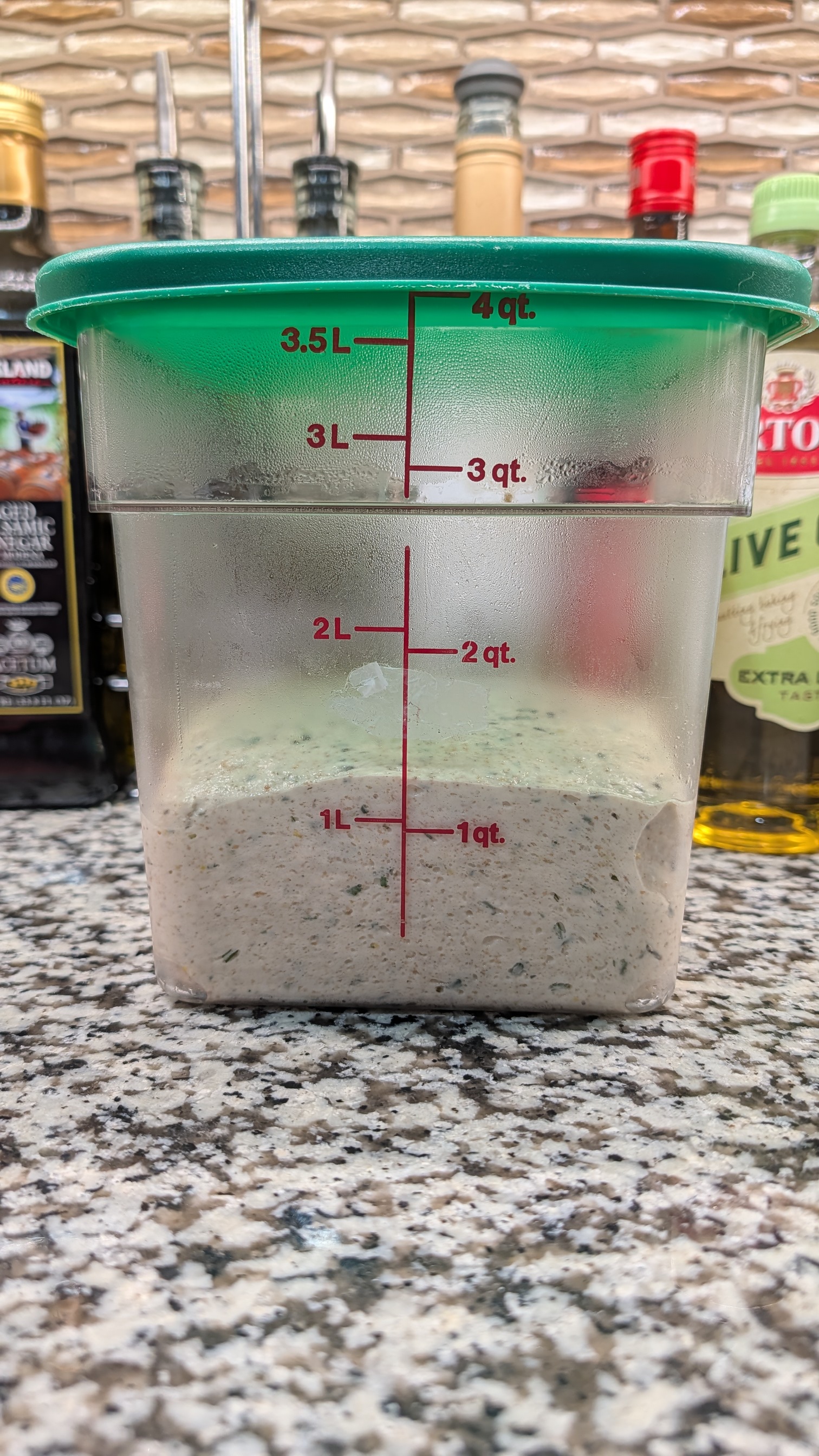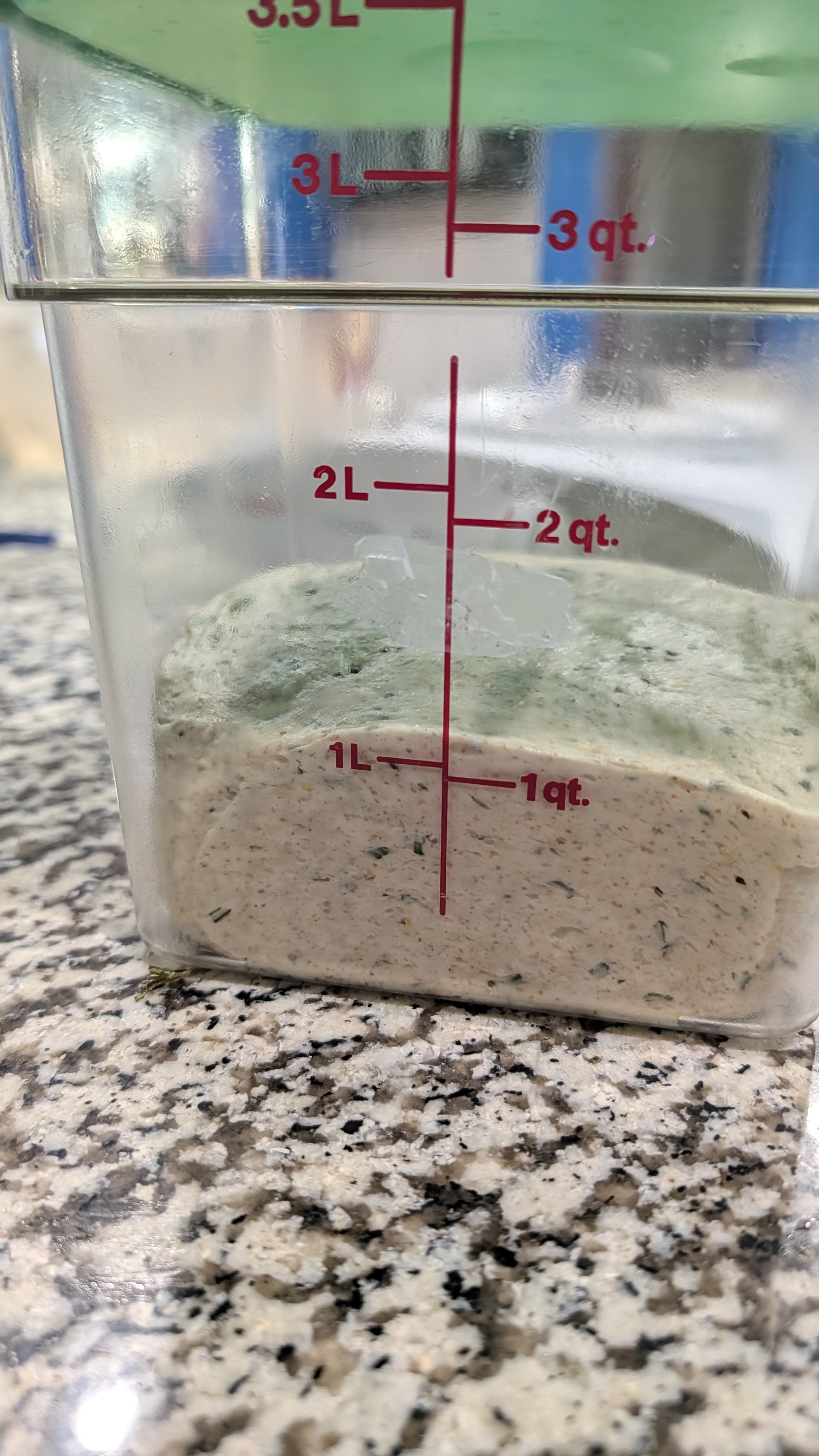 The bulk fermentation process at room temperature is advancing at an unsatisfactorily slow rate. I am concluding my efforts for the night and proceeding to rest. After weighing two alternatives, Move the dough to the back porch where the overnight temperature is expected to drop to 60° F Leave the dough in the kitchen  I have opted for the second option. Even considering the exponential growth associated with wild yeast, I am confident that I can safely take a six-hour nap. I hope that my preference for a shorter process does not ultimately lead to unfavorable consequences.